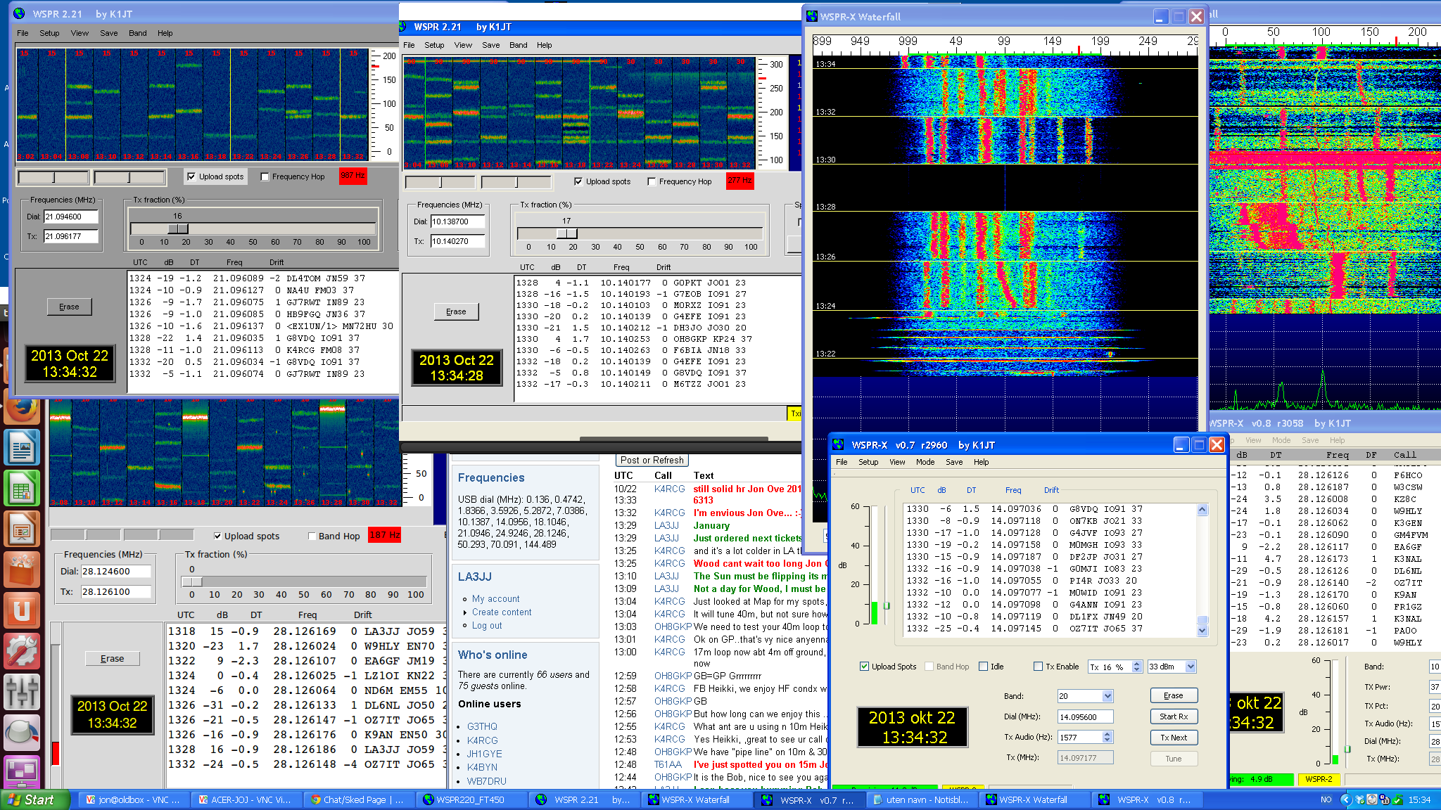 5 instances of WSPR on the same screen, the lower left is WSPR 4.0 running on Ubuntu in my