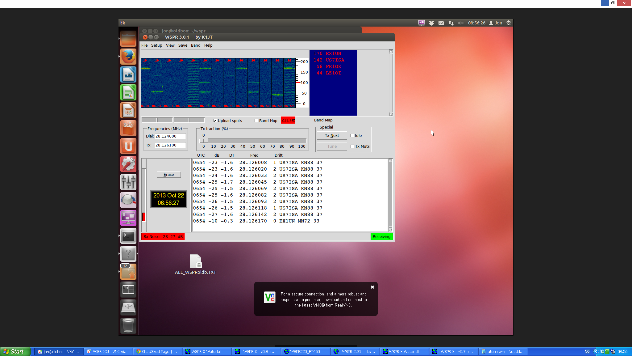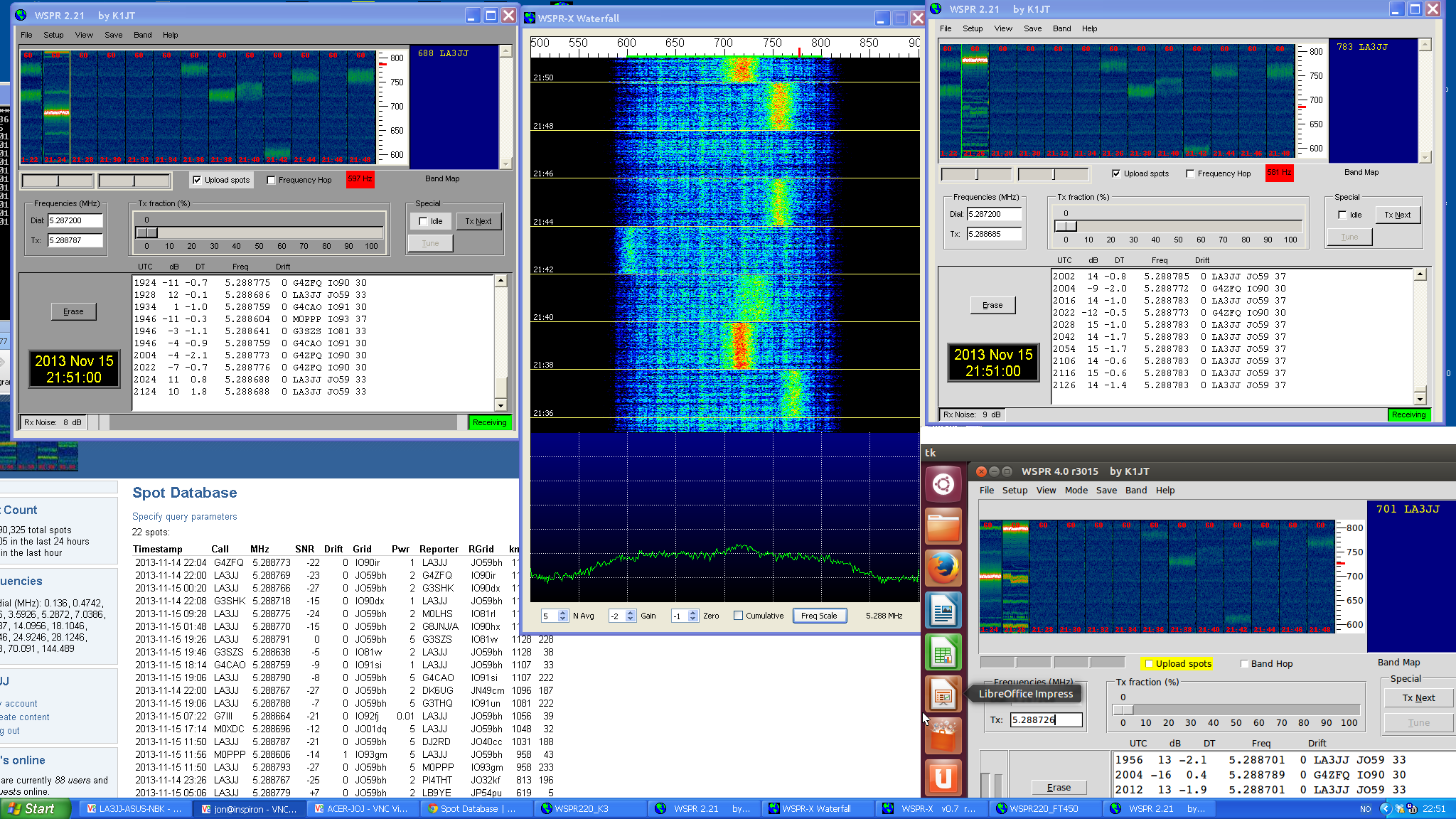 5 instances of WSPR on the same screen, the lower left is WSPR 4.0 running on Ubuntu in my